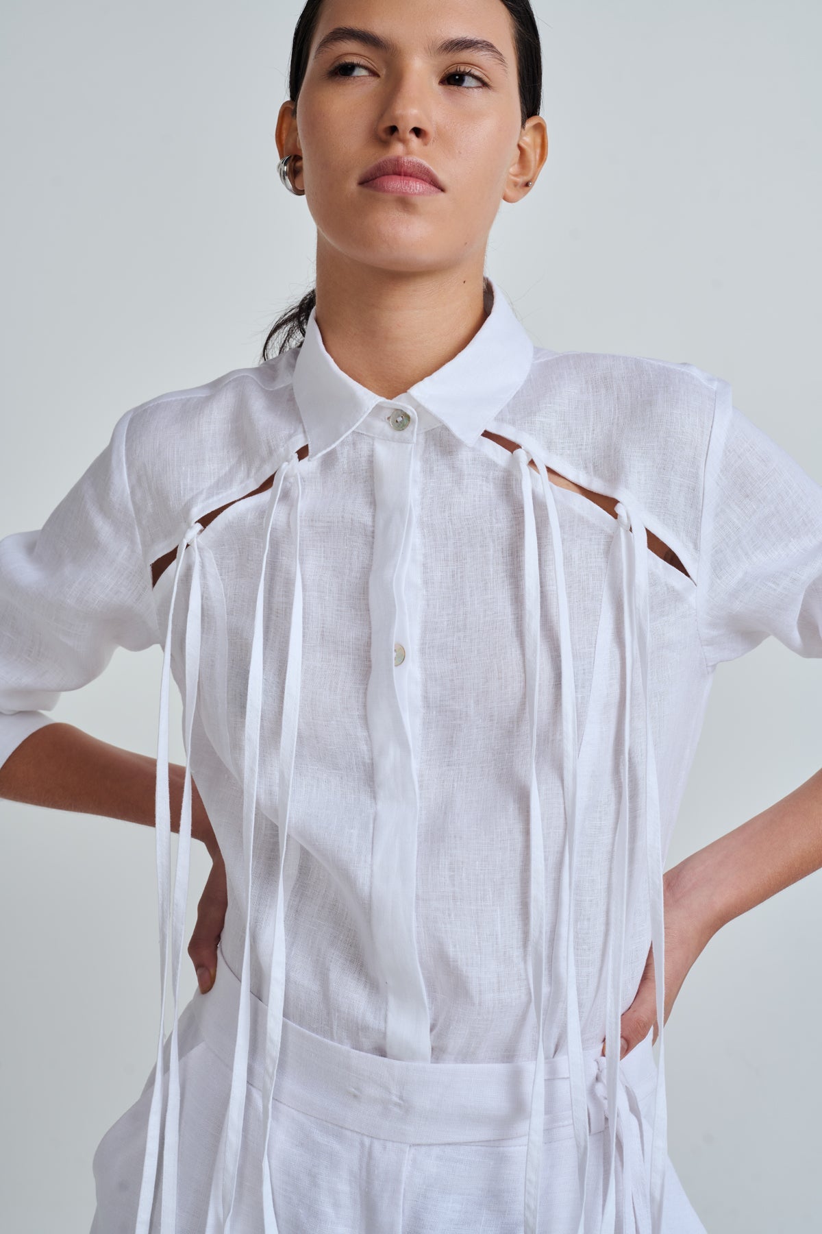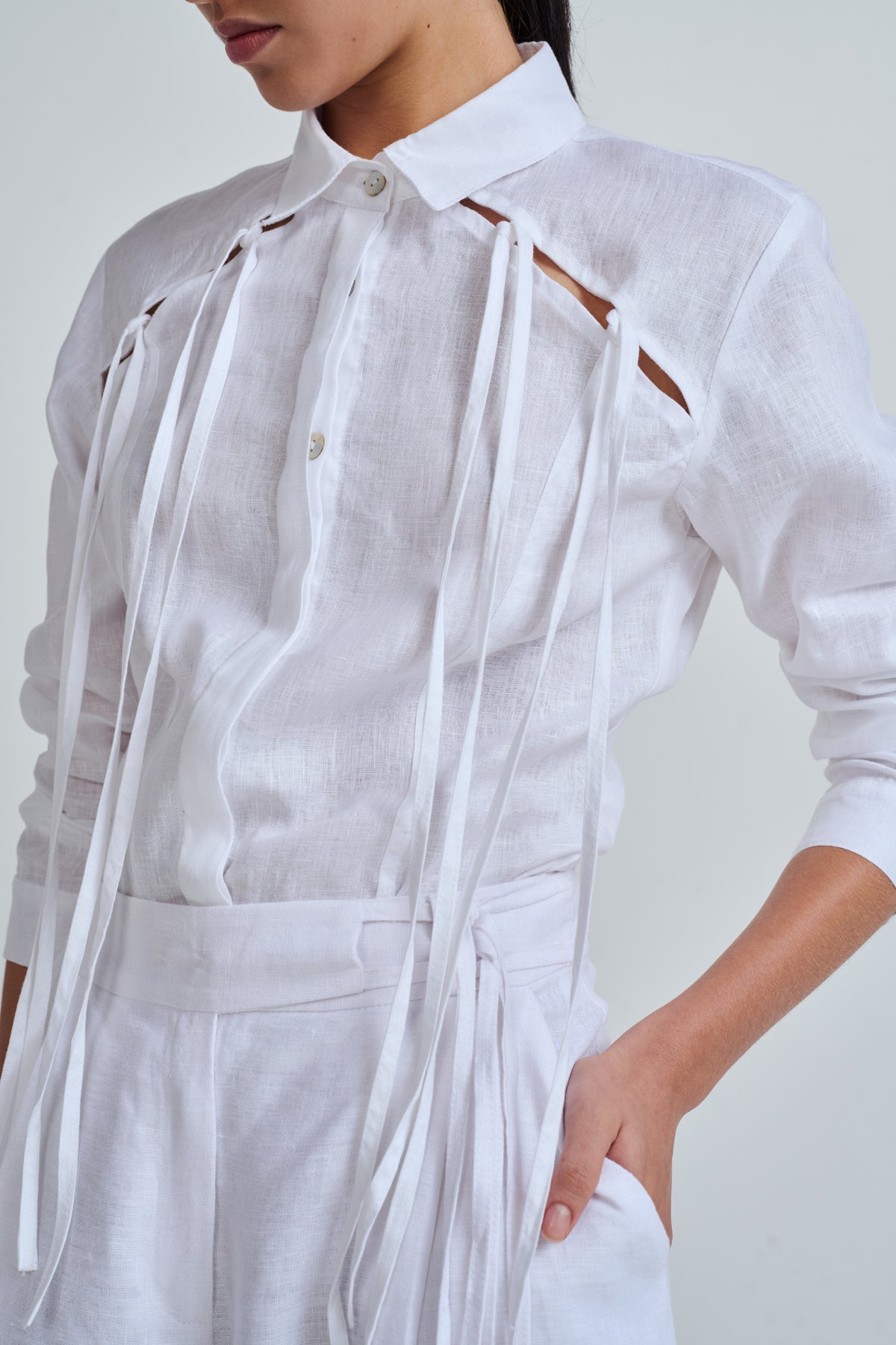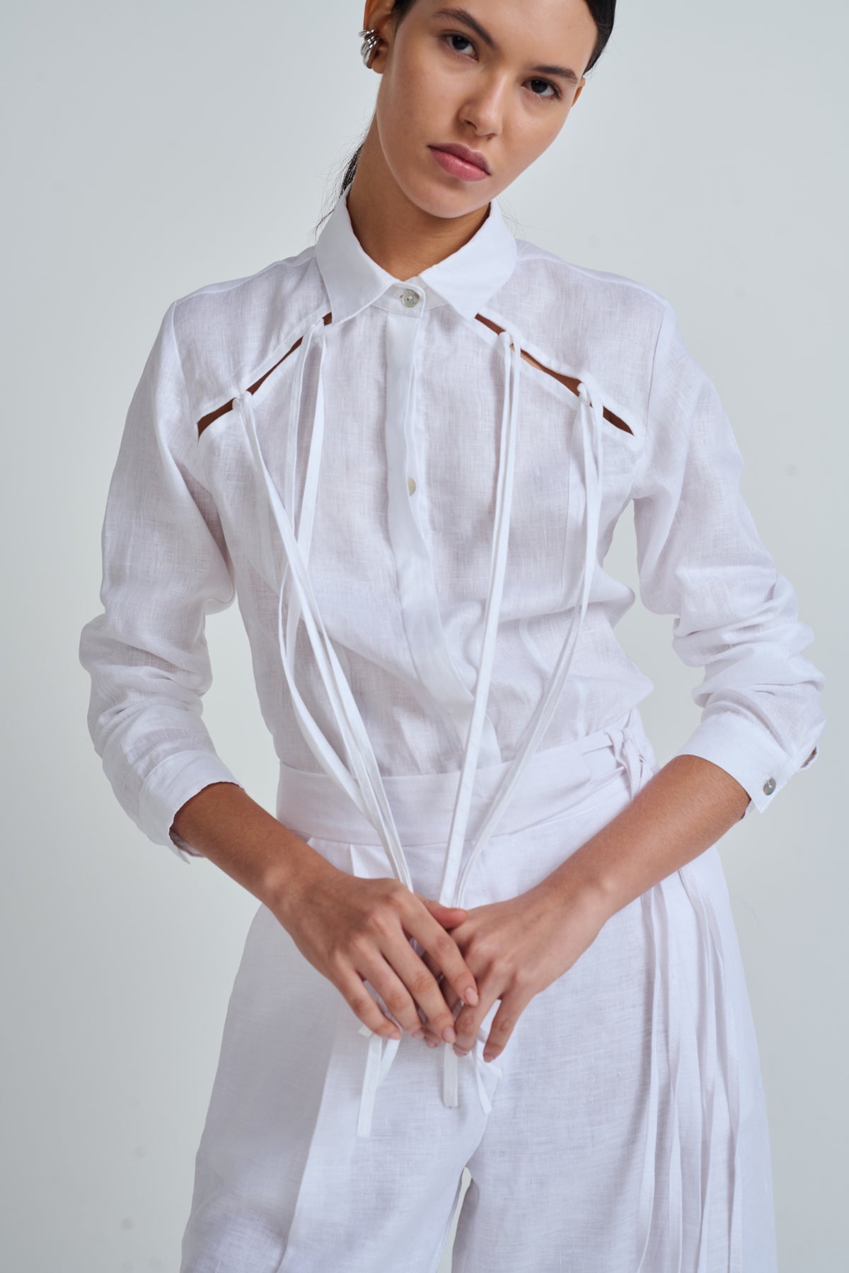 Long-sleeved shirt with collar, cut at the front with long decorative straps.