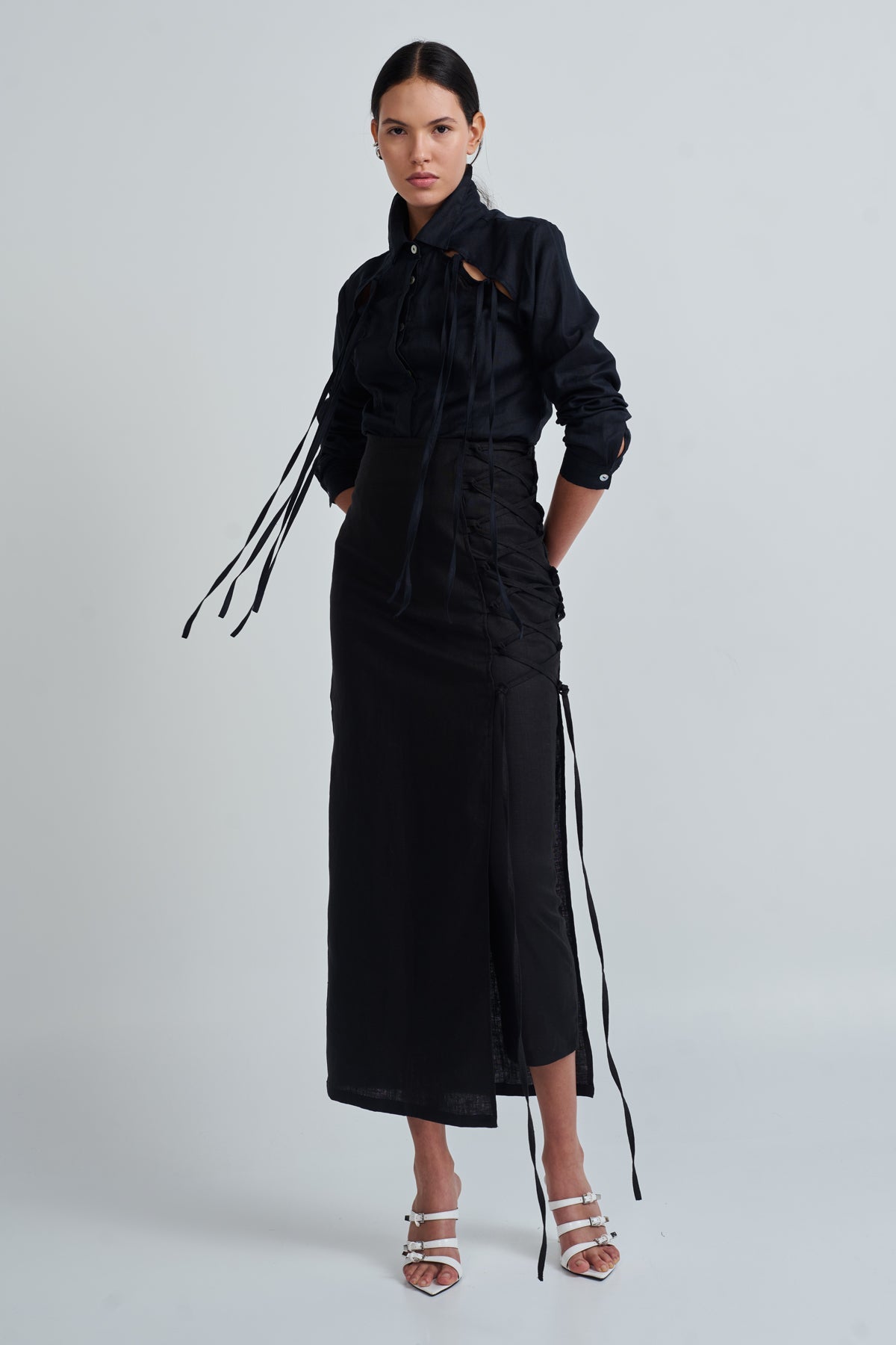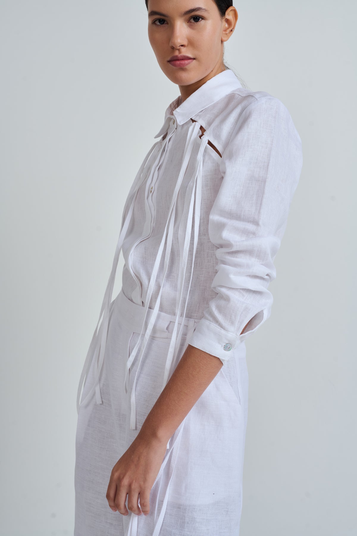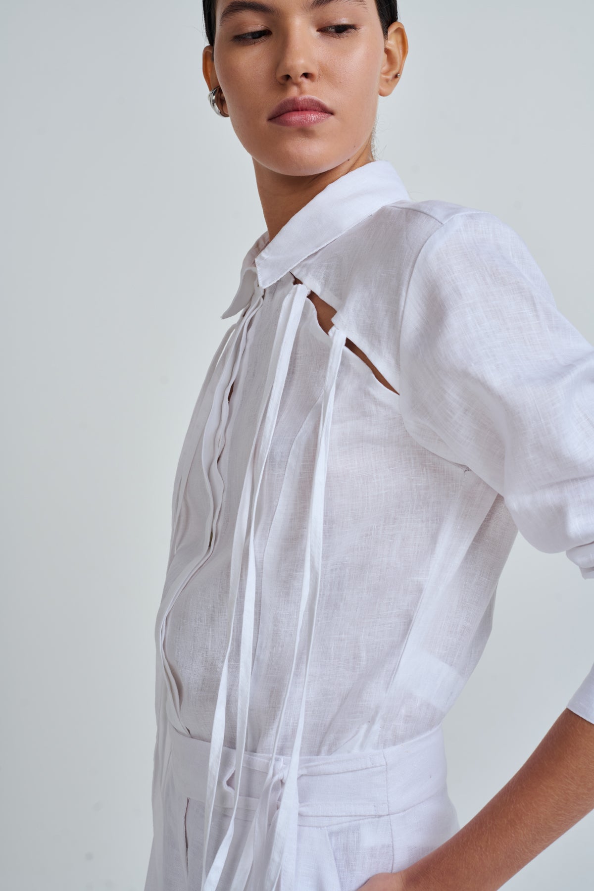 Long-sleeved shirt with collar, cut at the front with long decorative straps.