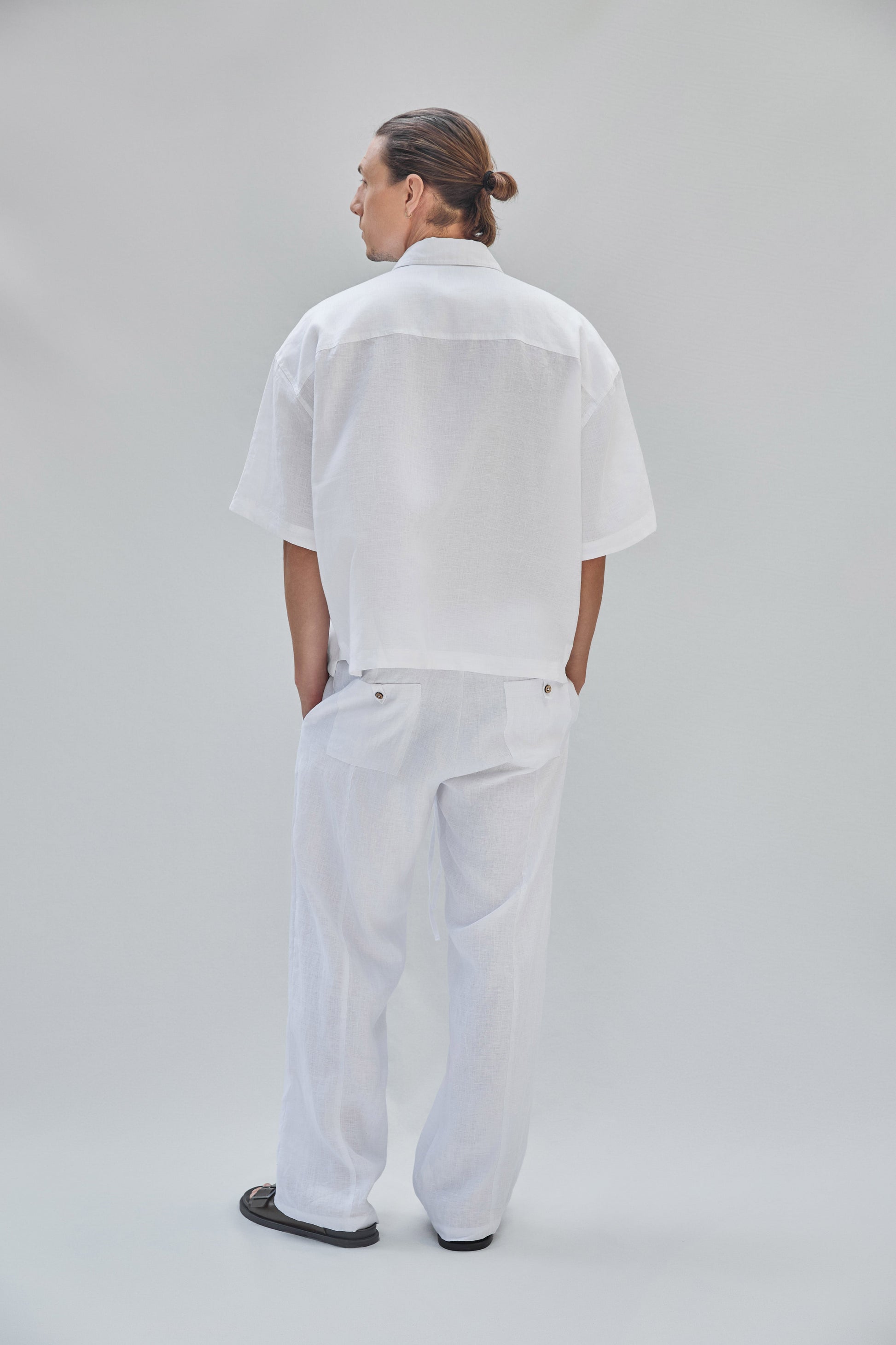 The GEORGE pants are tailored with ease and movement in mind. Made from 100% natural linen, they feature a mid-rise waist, straight wide-leg silhouette, and clean front pleats that add structure without compromising comfort. The elastic back waistband allows for a flexible fit, while side pockets add everyday functionality. Designed to be dressed up or down, GEORGE offers timeless versatility in a breathable, seasonless fabric.