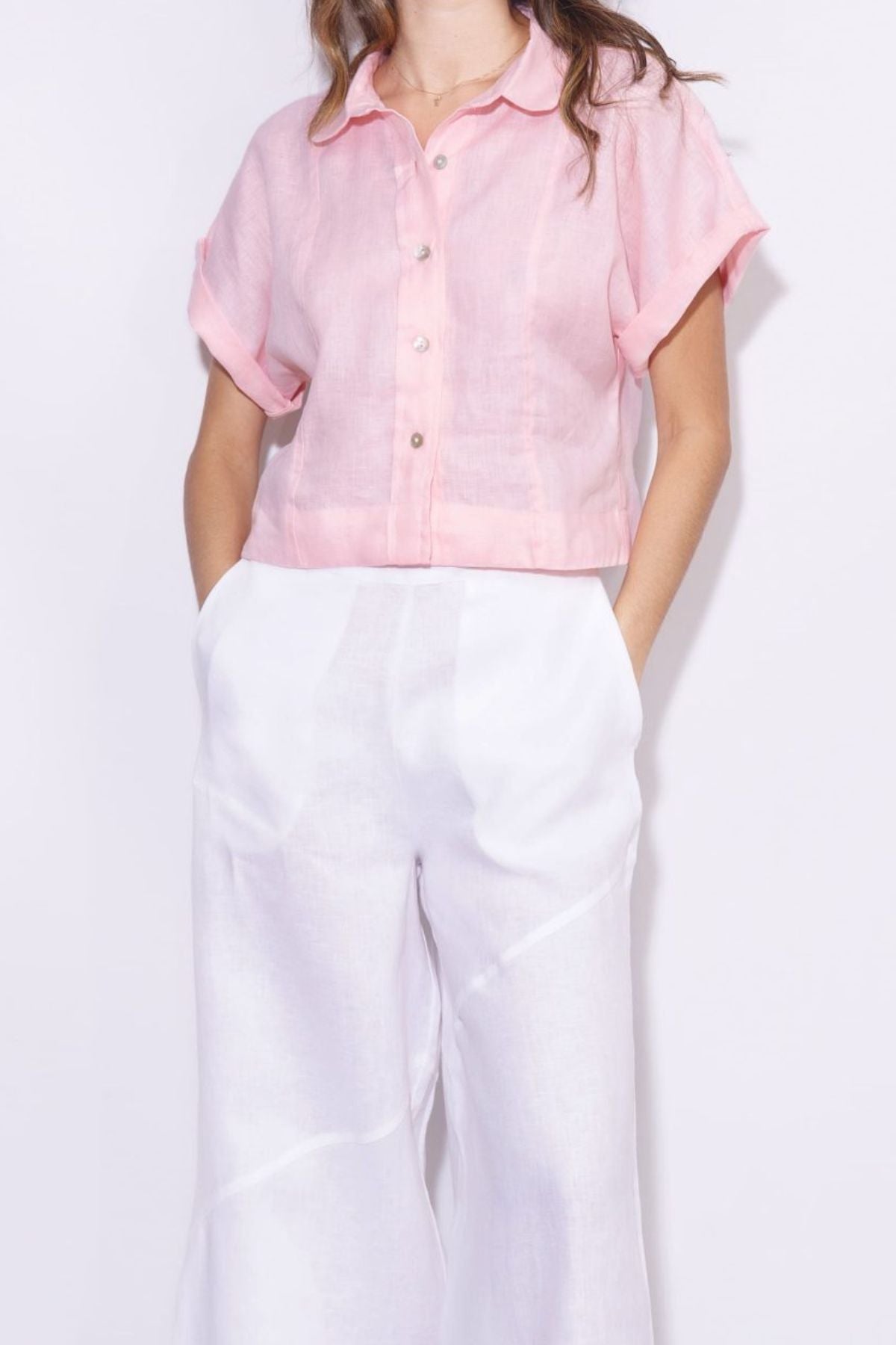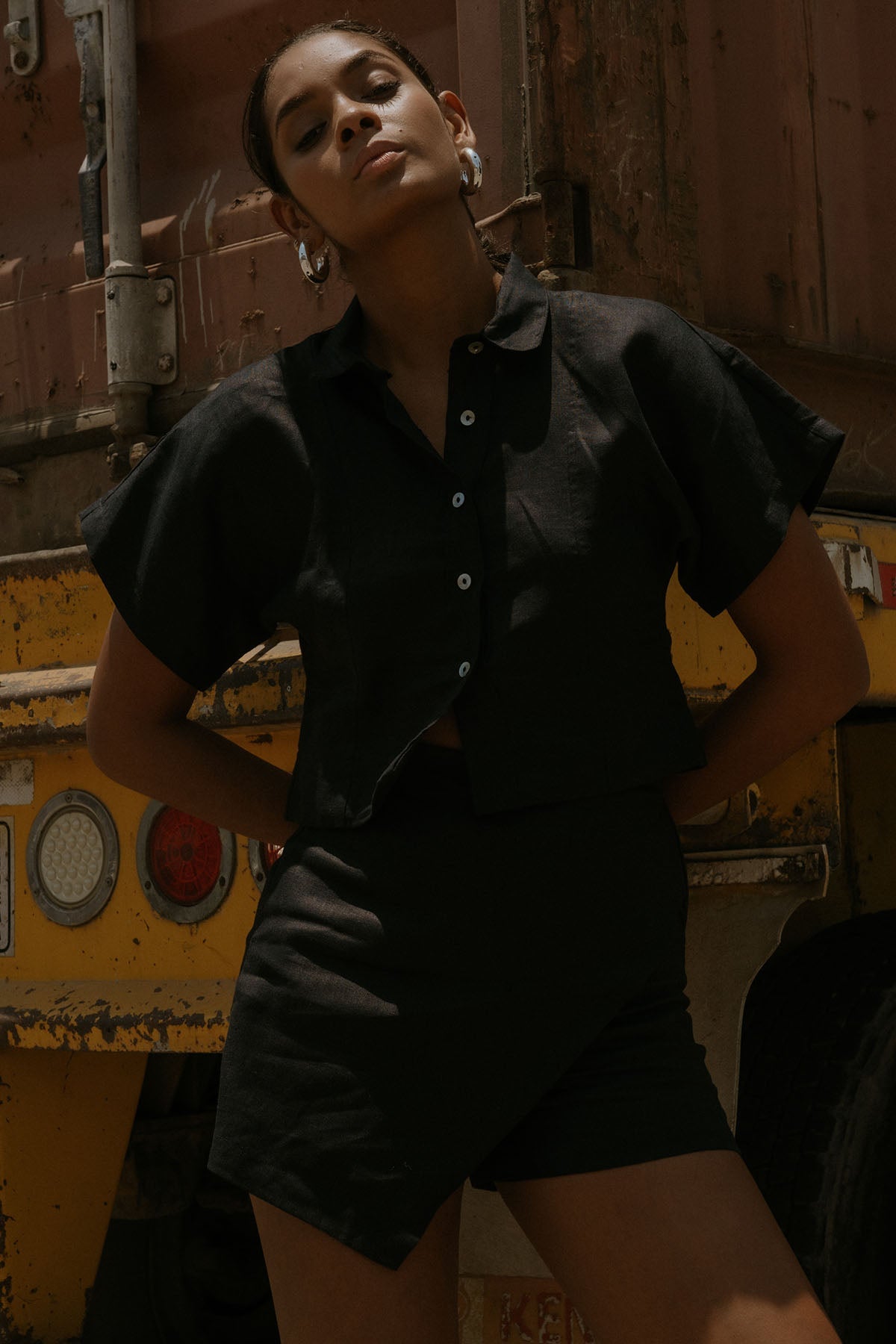 GRETA is eclectic, a combination of styles. Short rop style, it has a Peter Pan collar, short kimono sleeves and decorative darts. Give it a cooler touch by rolling it up. Combine it with our RITA high-waisted pants.
