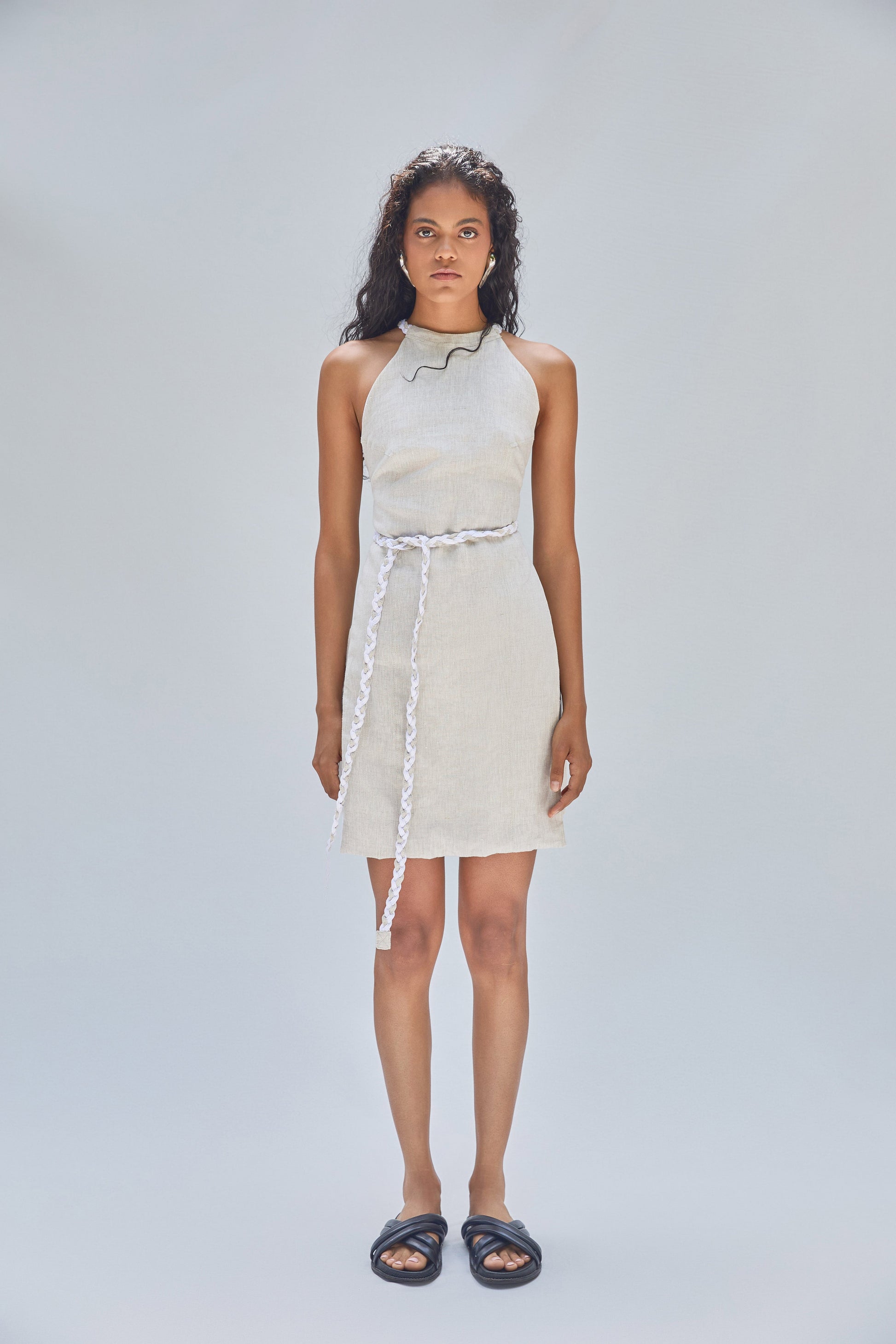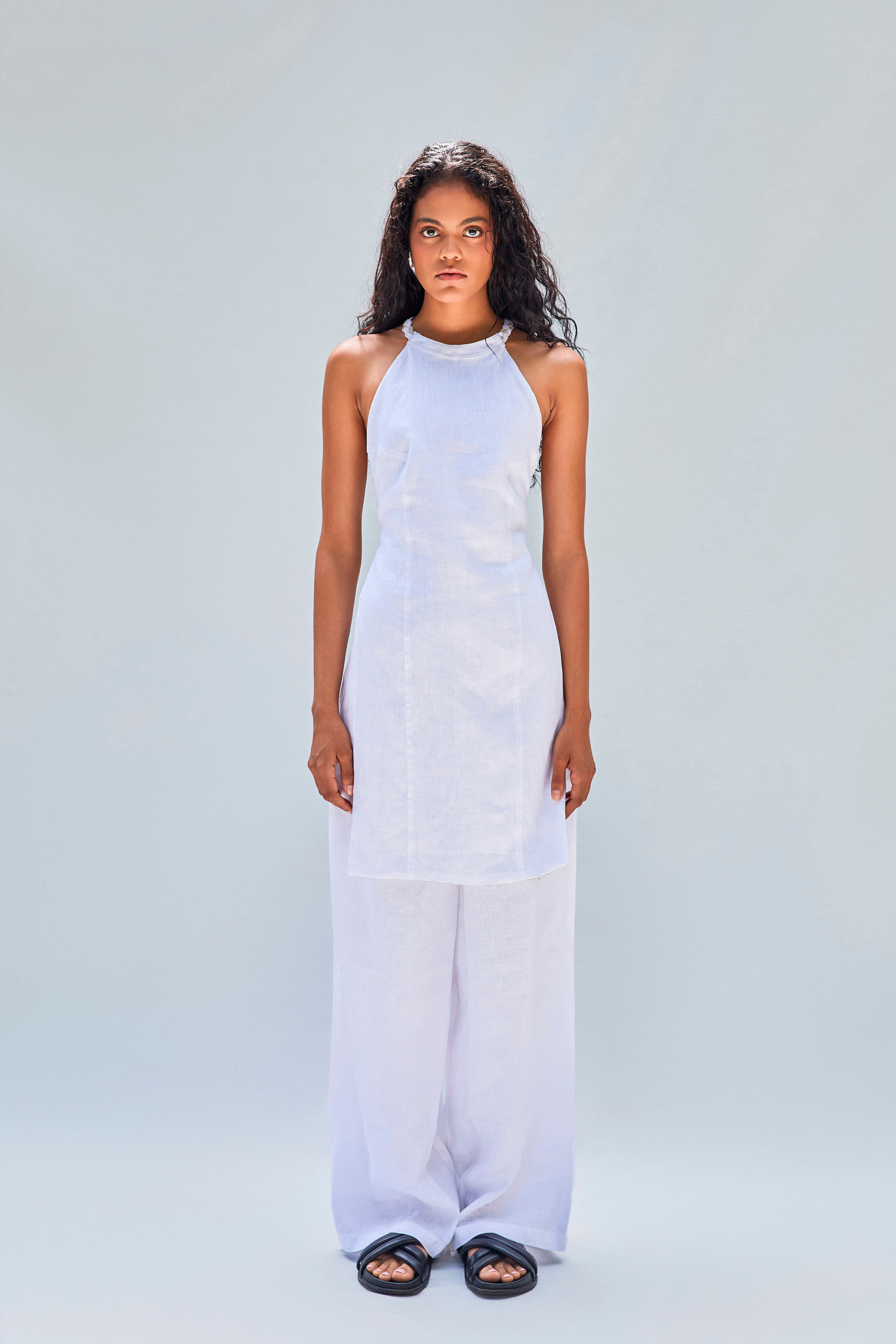 The LEO halter top is a bold yet minimal piece crafted from 100% natural linen. Its high neckline ties at the back for a customizable fit, while the open back and straight hemline add freshness and edge. Designed with clean lines and double-stitched finishes, LEO is lightweight and unlined, perfect for warm weather or layering under tailored pieces.