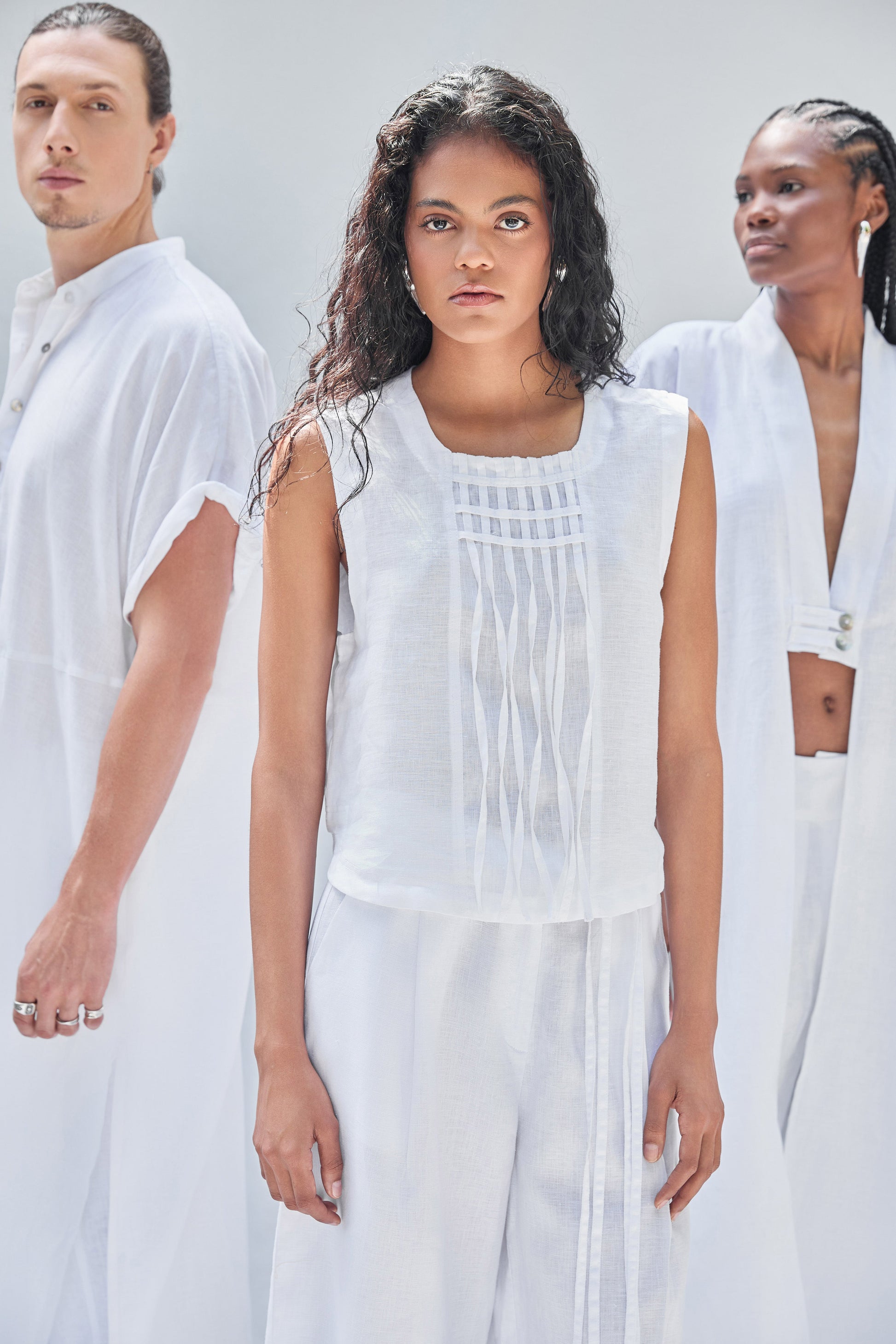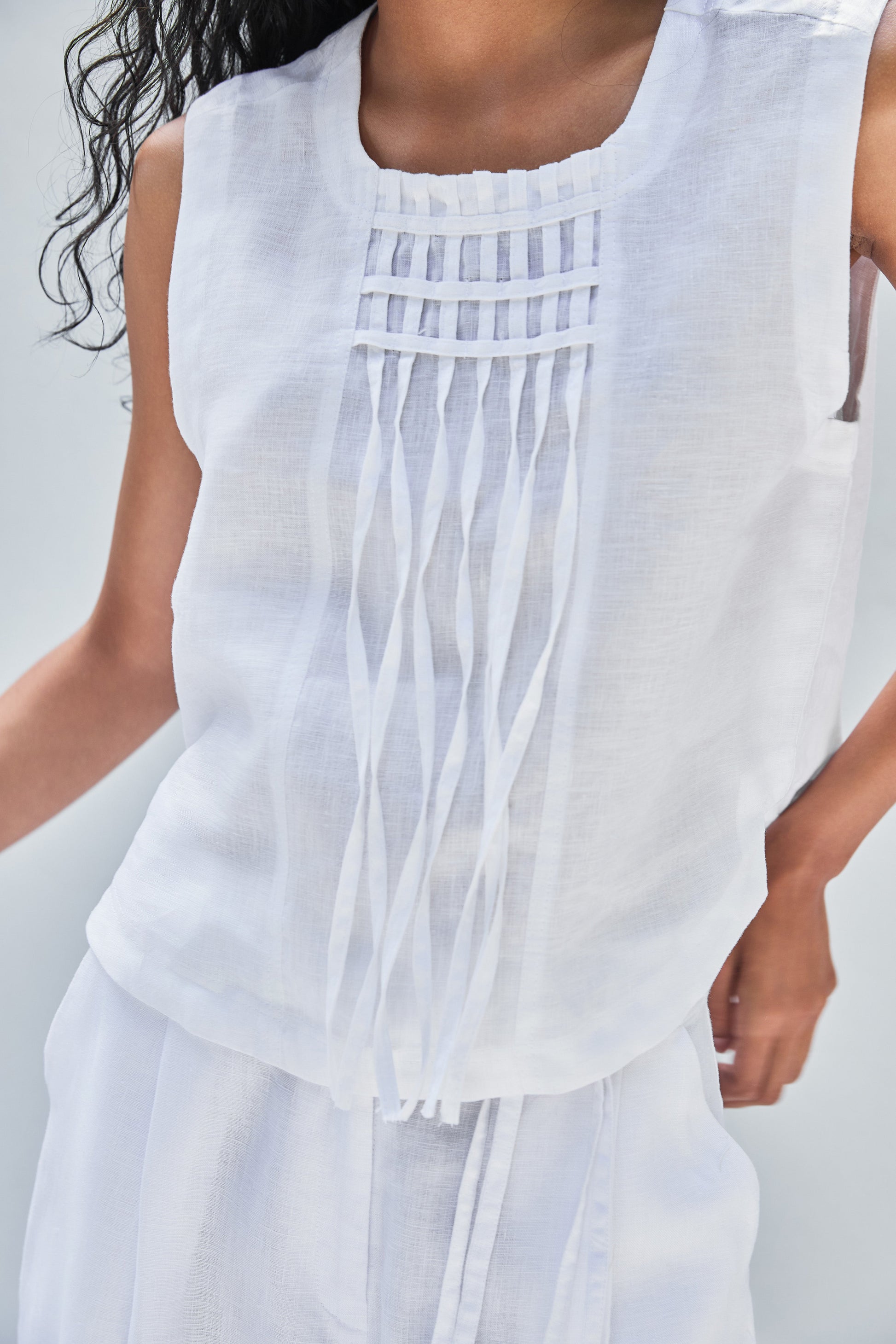 The MELI top is a fresh expression of subtle texture and clean design. Crafted from 100% natural linen, it features a vertical front detail with soft linen fringe that adds gentle movement and personality to the piece. Its sleeveless cut, rounded neckline, and straight silhouette are accented by square side cut-outs and double stitching—thoughtful touches that elevate its simplicity. A single button closure at the back neckline allows for easy wear while preserving the clean lines of the front.