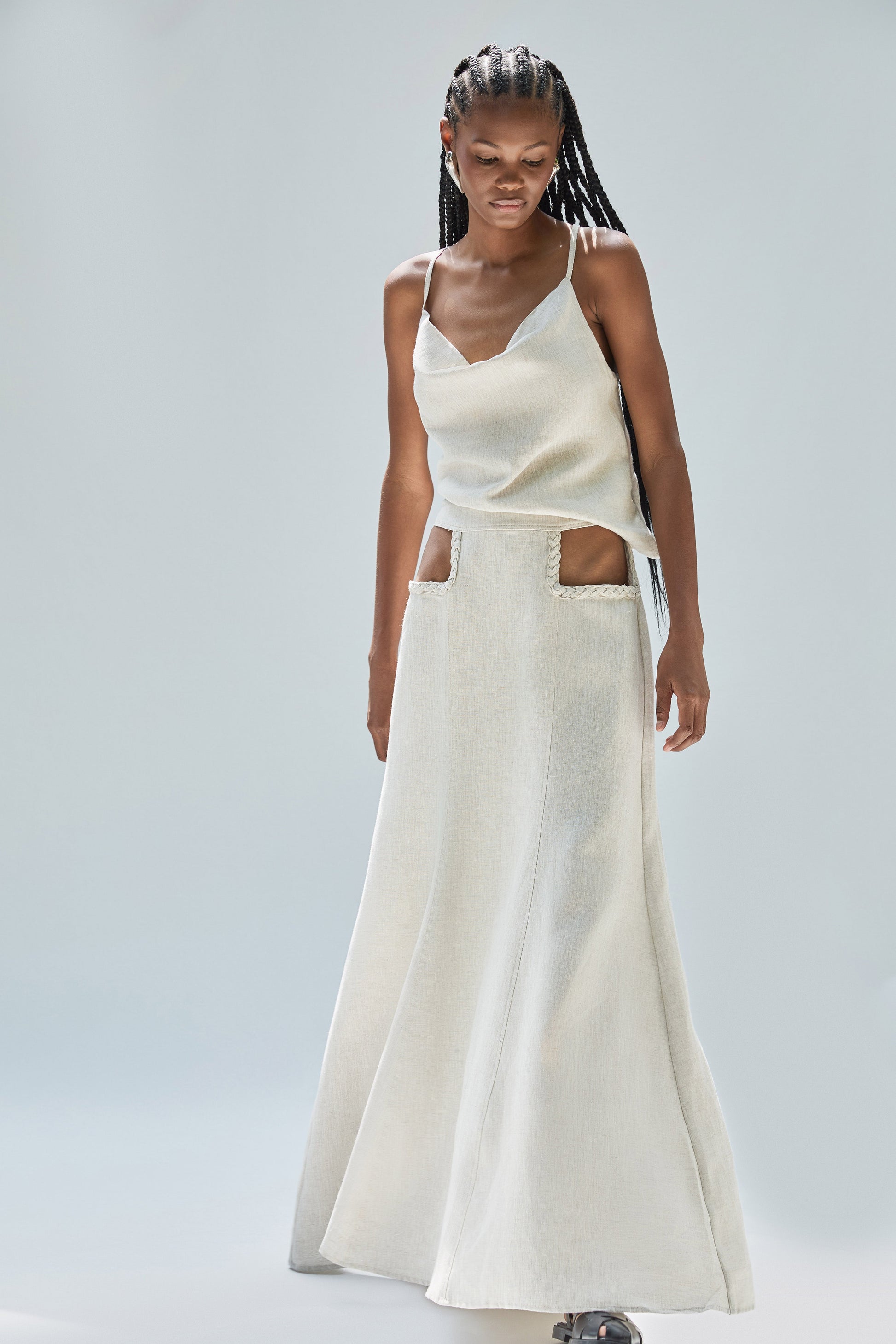 The MONI skirt offers fluid movement and understated elegance. Cut from 100% natural linen, it features a long, straight silhouette with side slits for ease and breathability. The high-rise waistband and hidden side zipper provide a clean fit, while the minimalist design makes it a versatile piece for both casual and elevated looks.