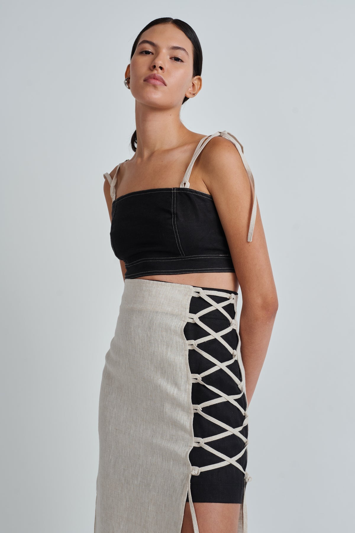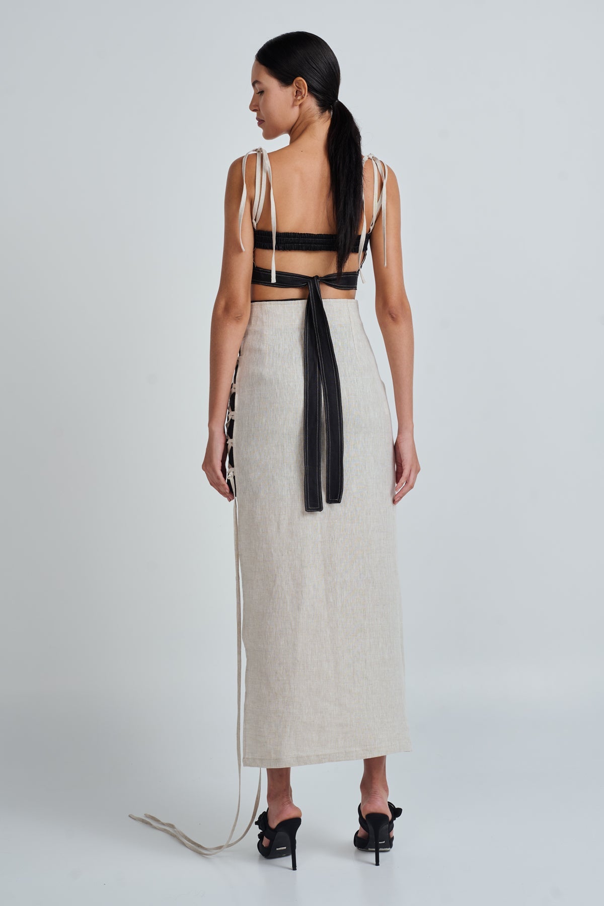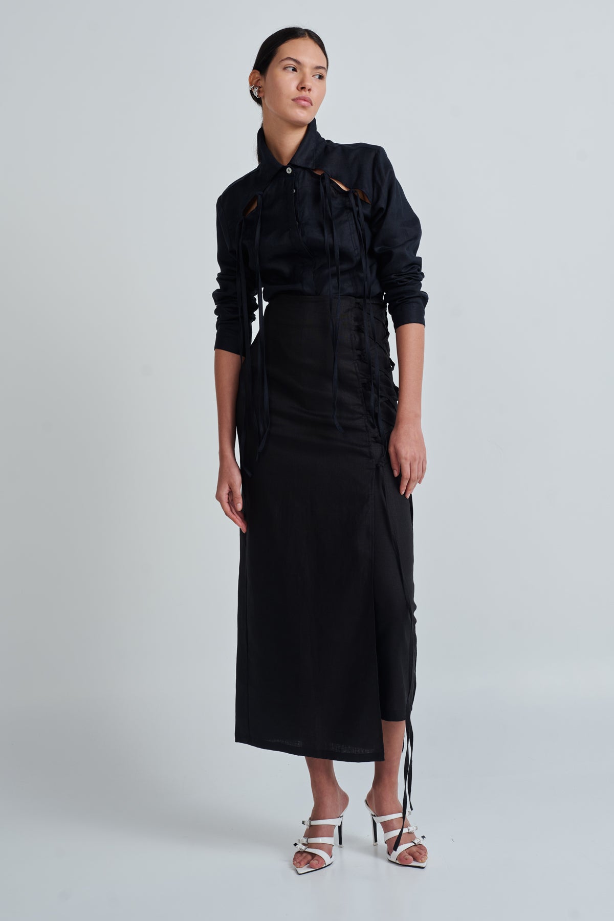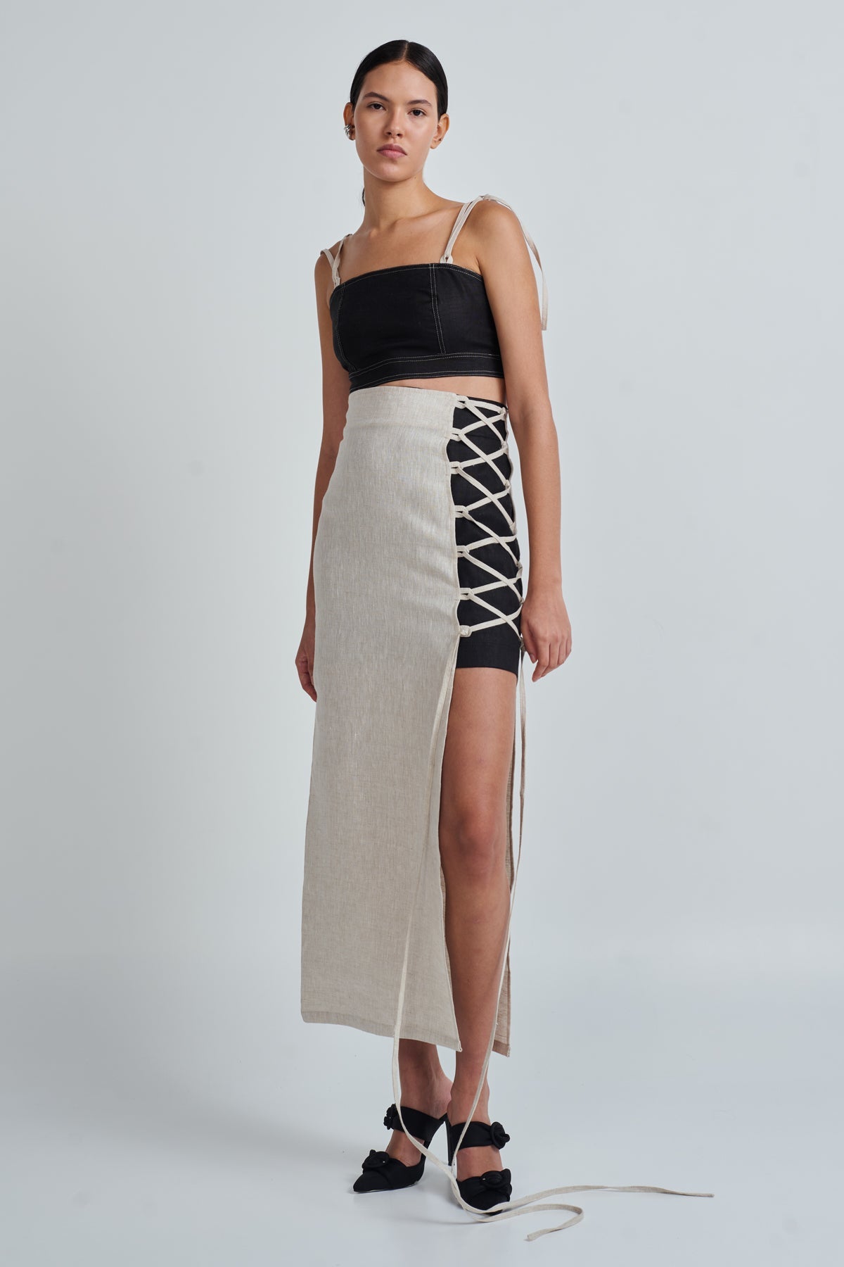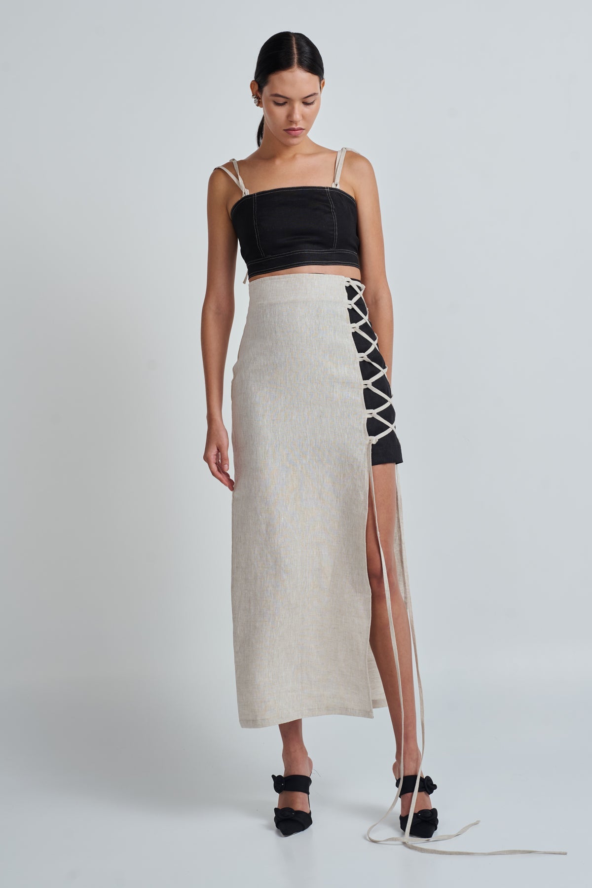 High-waisted long skirt with side opening and eyelets for tying extra long corset-type straps.